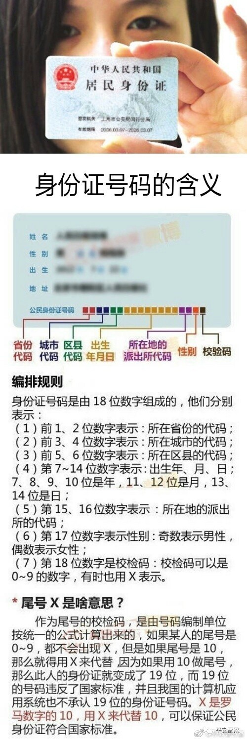 号码1、2位省份代码;3、4位城市代码;5、6位区县代码;7~14位出生年月日;15、16位派出所代码;17位性别:奇数男性,偶数女性;18位是校检码,是0~10的数字,10用X表示…戳图↓↓