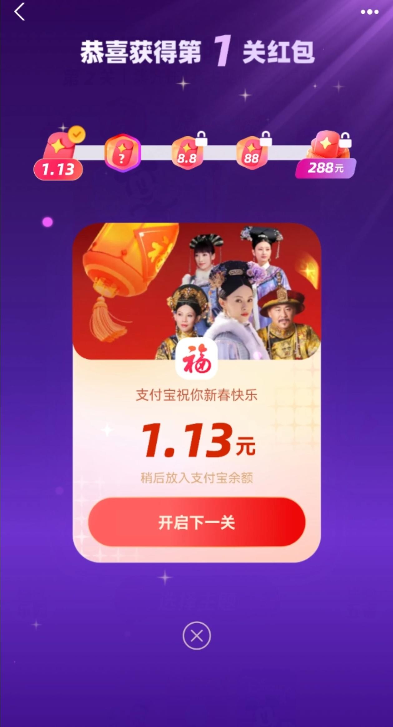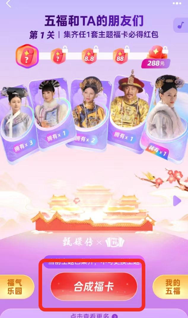 记者大约扫了六七次,就轻松集齐4张卡,合成后获得了“甄嬛传”主题的支付宝app的皮肤,领取红包“开启下一关”,则可以继续闯关合成开奖。据悉,今年开奖不用等到除夕,并且可以一直集福到大年初五,这也是今年集福最大的变化之一。
