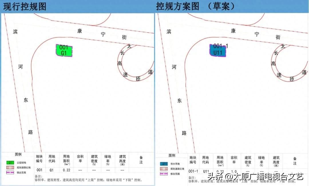 根据现行控规图显示,地块001用于公园绿地,用地面积为0.22公顷。控规方案图(草案)显示,地块001-1用于供水用地,用地面积为0.22公顷。