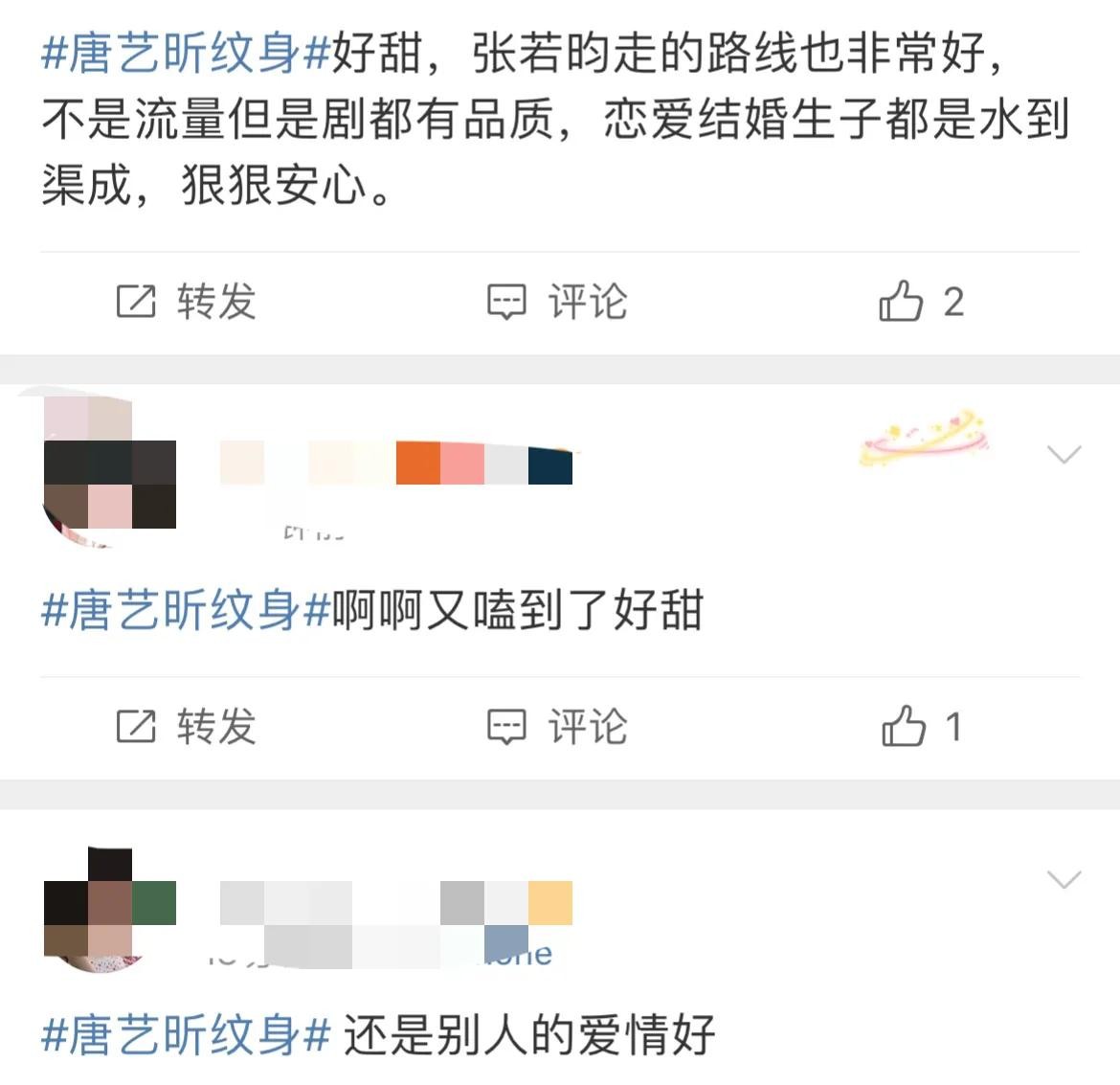 细看二人的纹身,唐艺昕的是:love you as love life(爱你就像爱生命),而张若昀的恰好是反过来:love life as love you(爱生命一样爱你)