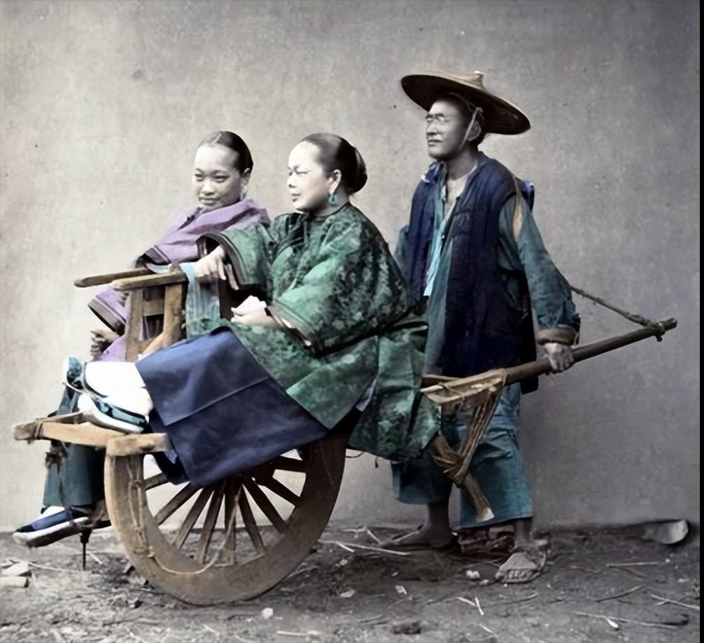 2、一位裹着三寸金莲的地主婆,骑着家中仆人拉的马出去转悠。