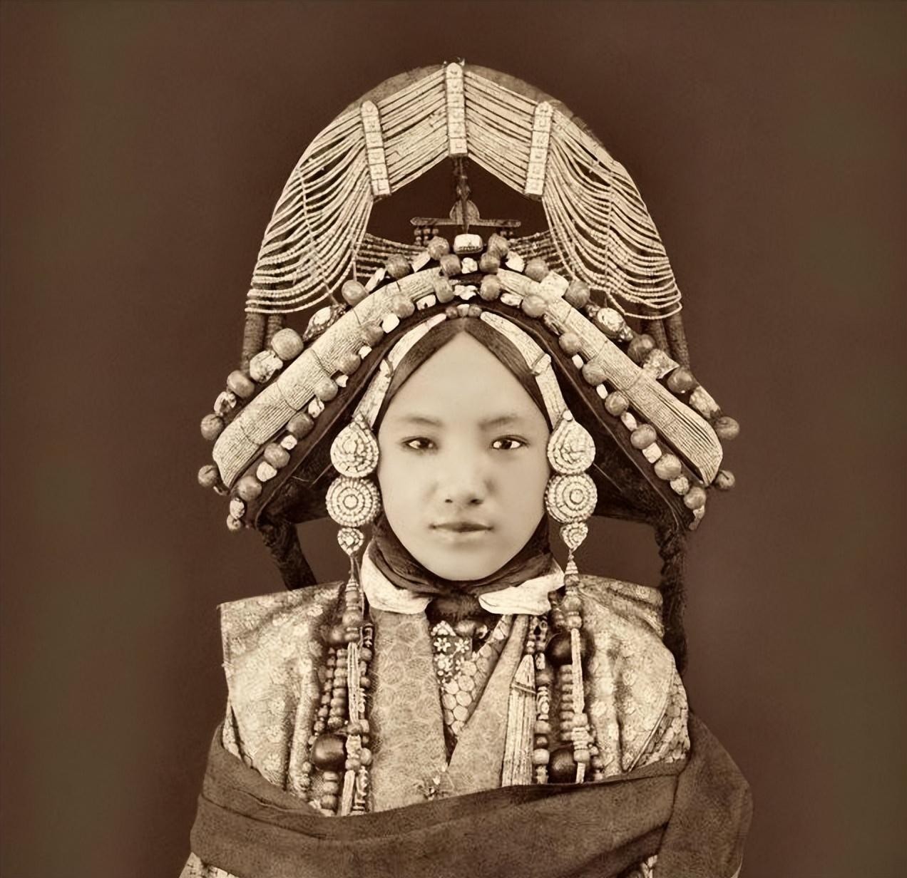 12.1879年,头上和身上佩戴着华丽配饰的西藏女子。