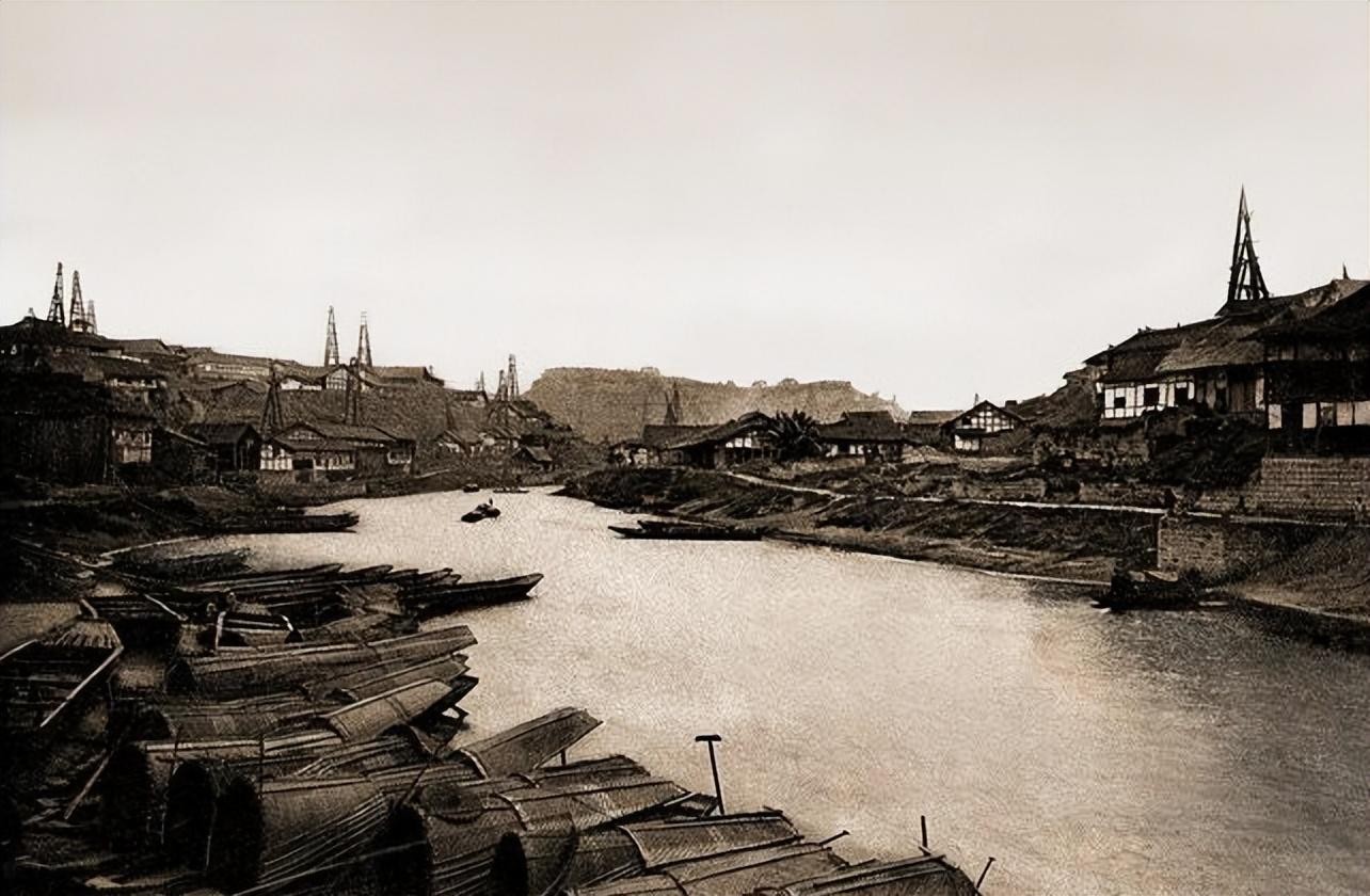 13.1906年,四川境内的一处河道,河边停靠着许多小船。