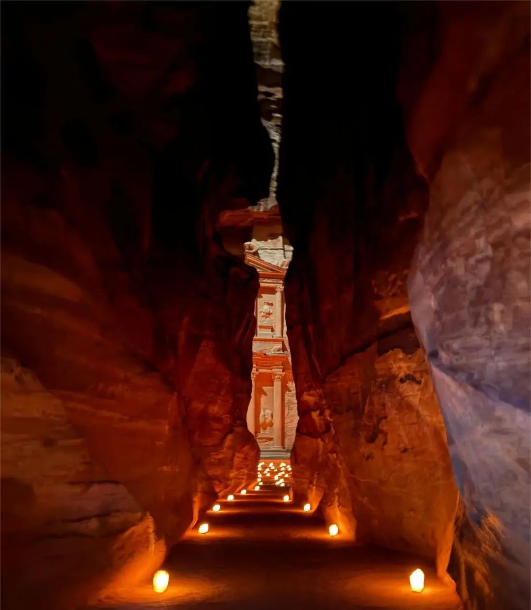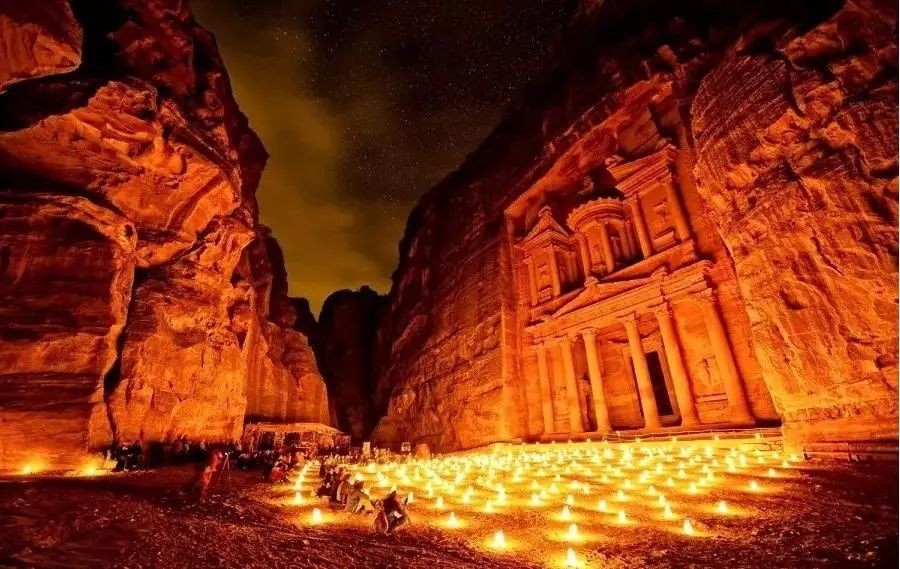 佩特拉是约旦著名古城遗址,位于约旦南部,距离首都安曼约260公里,隐藏在死海和亚喀巴湾之间的深山峡谷中,古时曾是地区重要贸易中心。佩特拉古城入口是一条狭窄峡谷通道,城内有广场、神殿、露天剧场、寺院等建筑,融合了古希腊、古罗马等多种风格。佩特拉在希腊语中意为“岩石”,因其建筑大多雕刻在红褐色岩壁上,在阳光下熠熠生辉呈现出美丽的红色而被誉为“玫瑰之城”。