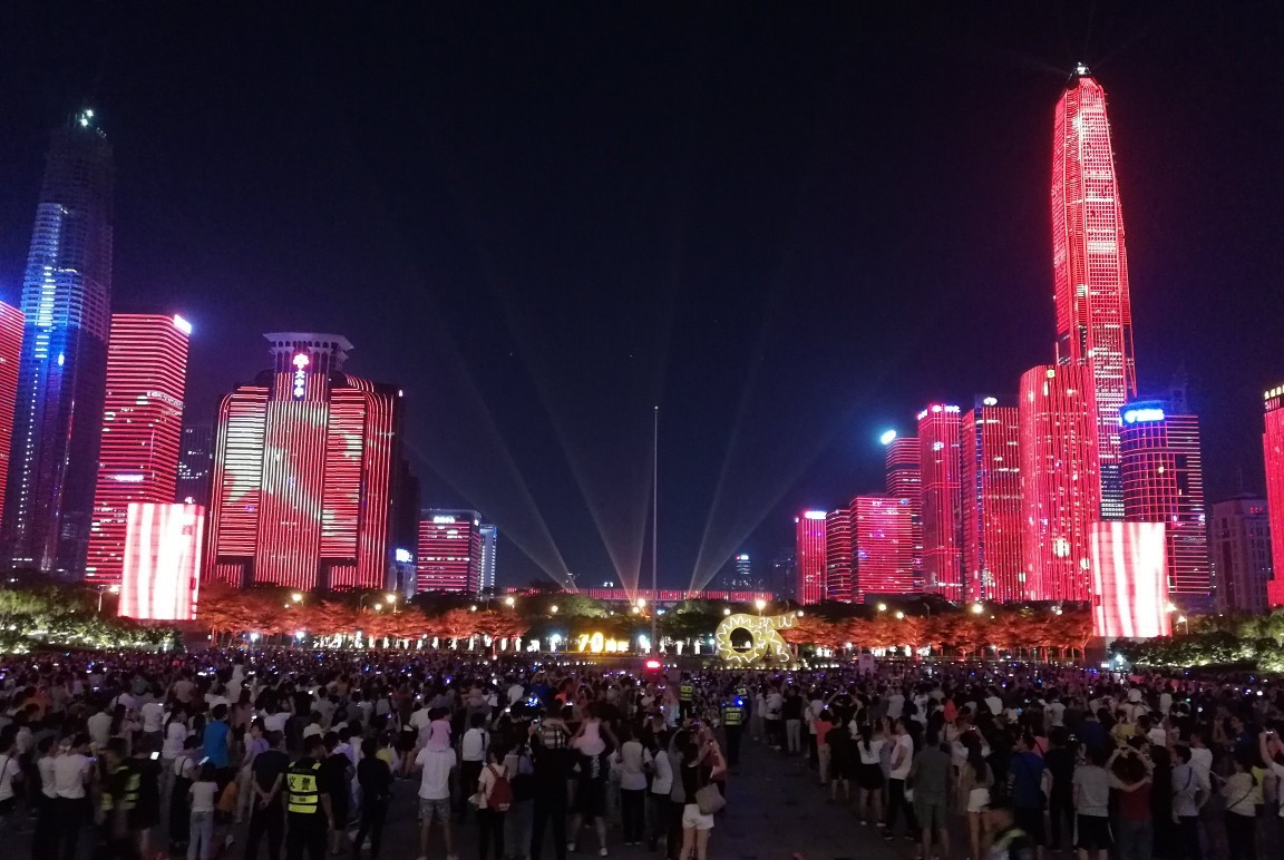 由远及近依次是:莲花山、市民中心、市民广场(北广场)、深南大道、市民广场(南广场)