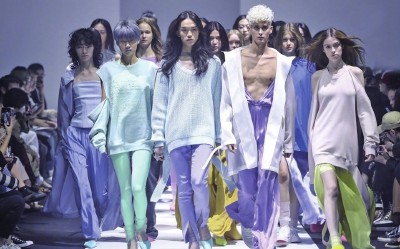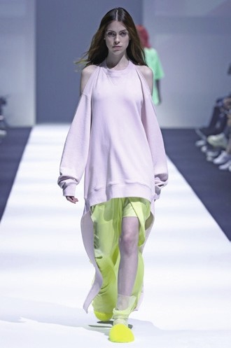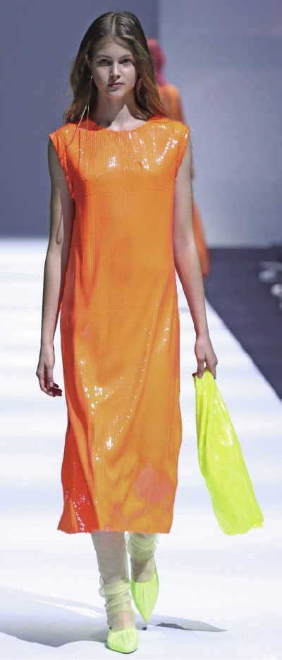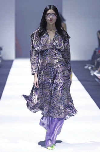那么,秀场上的衣服到底如何呢?看完这场秀,感觉像是参加了一档旧衣改造节目,衣服的设计和搭配总有一种说不清道不明的“土味”。比如说助动车雨衣搭配雪青色健美裤和自制丝袜,颜色闪亮到手机像素不足以呈现的风衣,去年流行的宽大卫衣剪开袖子搭配前几年流行的不规则下摆彩色雪纺裙,上世纪90年代豹纹风衣搭配外贸店彩色百褶广场舞裙裤,超市同款塑料桌布连衣裙……