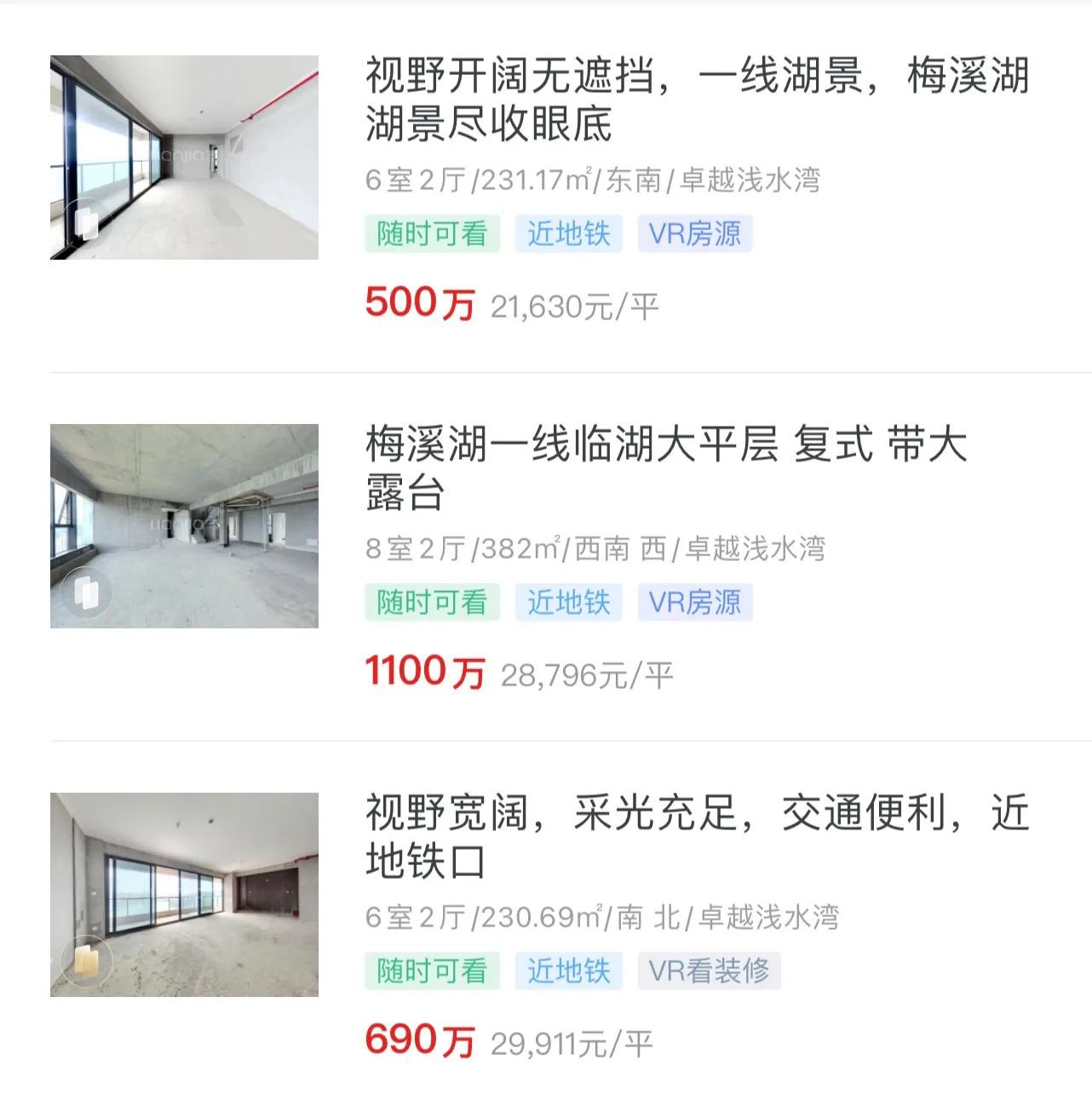 12、目前二手挂牌情况:目前挂牌的167套二手房源中,单价最低的为1.44万/平的94平简单装修小三房,单价最高的为2.99万/平的231平毛坯湖景6房大平层,与当下大平层受欢迎溢价高的情况相符