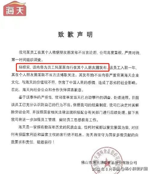 不过,现如今,海天已经深刻认识到了错误,将该名员工开除,道歉态度很诚恳,所以希望网友们可以理智看待,不要将对个人的怒气发泄到企业、节目上。
