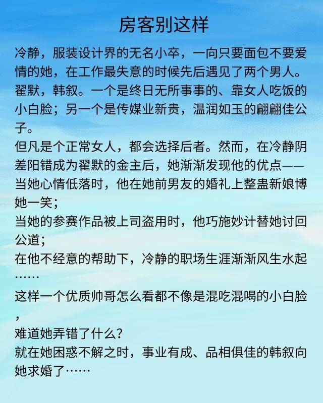 蓝白色的文笔富有镜头感,这篇文章里的描述自然让人感同身受。事实上,这是一个虐心的故事,女主很懂人心,明白能最大程度上伤害自己的人,必然是自己深爱的人。男主也是优秀,对女主有矛盾,但最终深爱战胜一切。