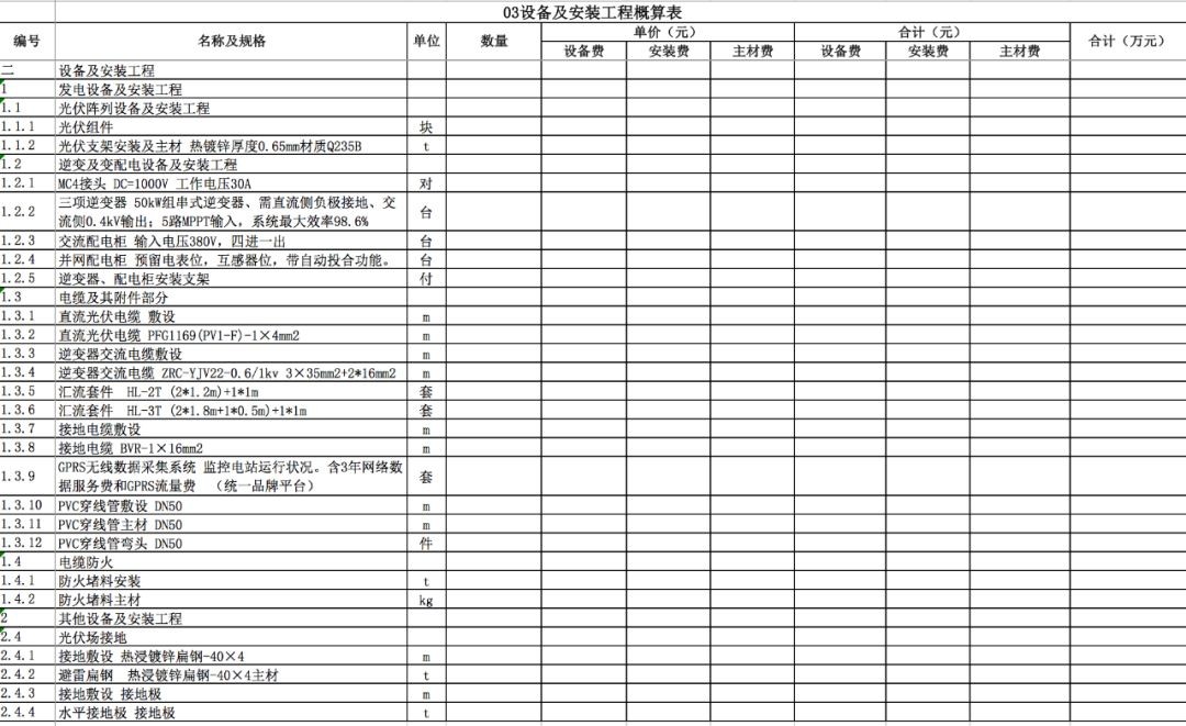 包含:发电设备(组件、逆变器、支架、电缆、接地)、升压变电站设备、通信设备及其他设备的购买及安装费用。如下表所示。(某电站的电气设备项目附后)
