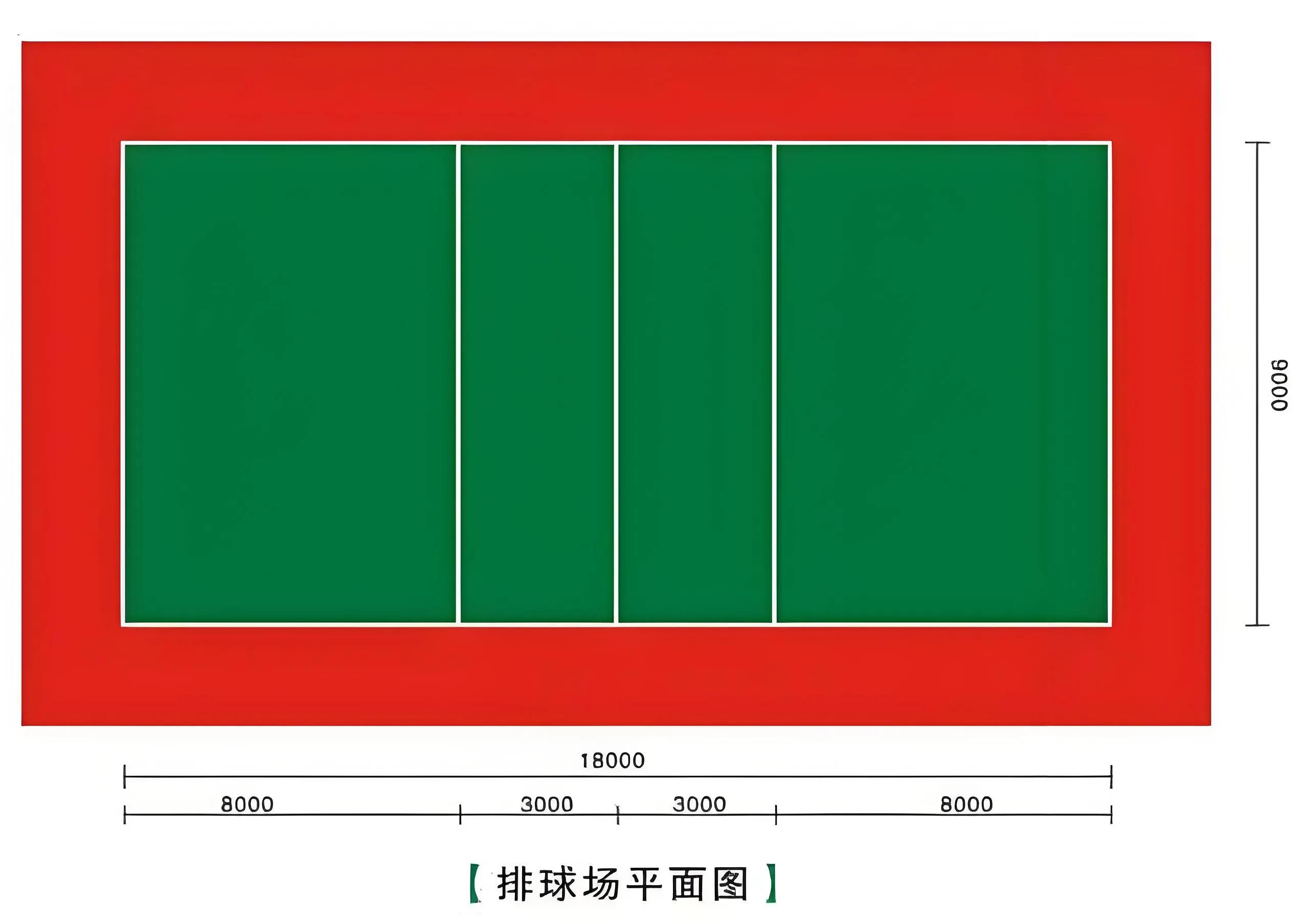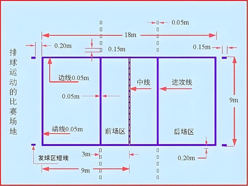 1,排球比赛的整个比赛球场:长是18米,宽是9米,球场的外围是没有障碍的区域,方便于排球运动员接球。