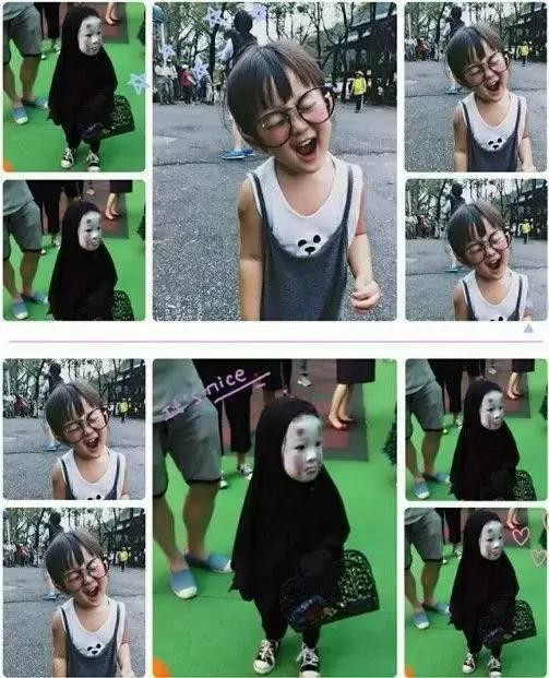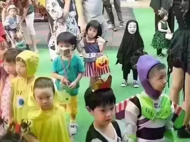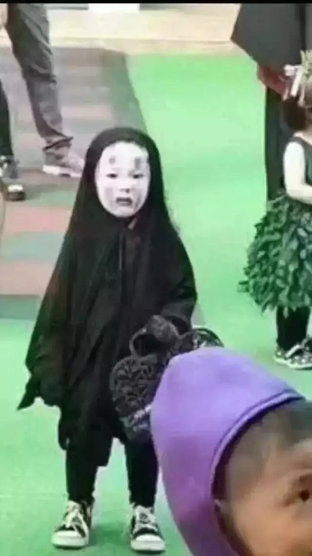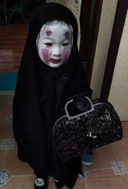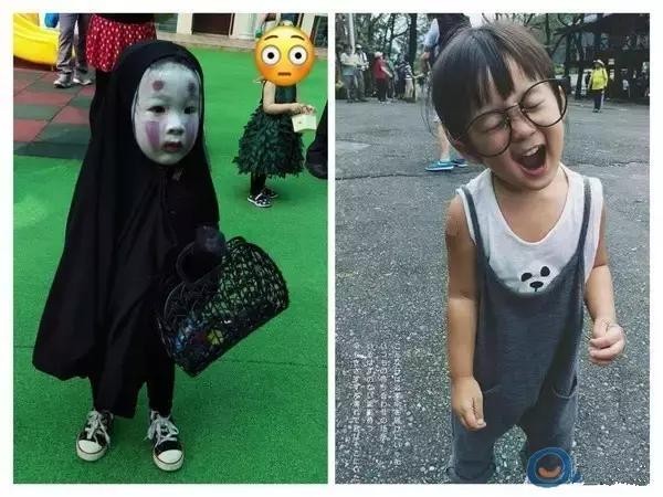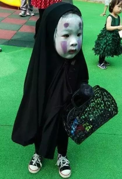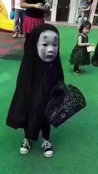 大家请勿惊慌害怕,其实这是一个幼儿园举办的万圣节变装派对,派对上一位妈妈为自己孩子打扮成了《千与千寻》中的无面男,不过比较之下画风就比较特别了!