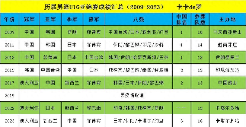 男篮U16亚锦赛成绩汇总(2009-2023)