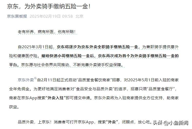 同样是今天(2月19日),京东发文称,自2025年3月1日起,京东将逐步为京东外卖全职骑手缴纳五险一金,为兼职骑手提供意外险和健康医疗险。继给快递小哥缴纳五险一金后,京东再次成为首个为外卖骑手缴纳五险一金的平台。