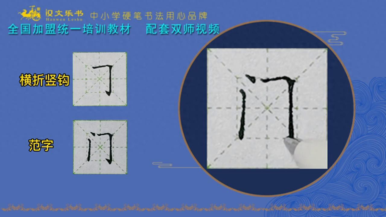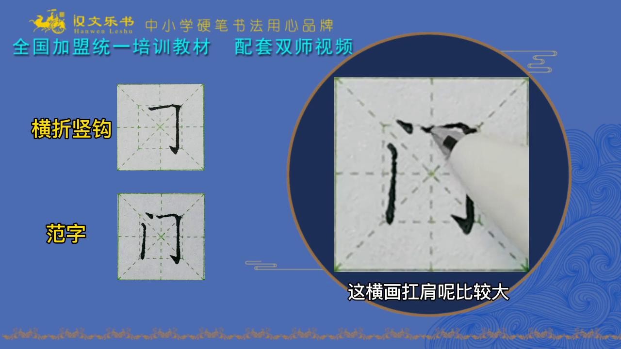 3. 第三笔横折竖勾,起笔是在竖中线稍微偏左边一点,就压着内宫格上线去起笔。这横画扛肩比较大,稍微写平一点。因为门这个字左边有个点,所以横这一部分也不要写太长,稍微短一点,过来以后平顿小退往下走。