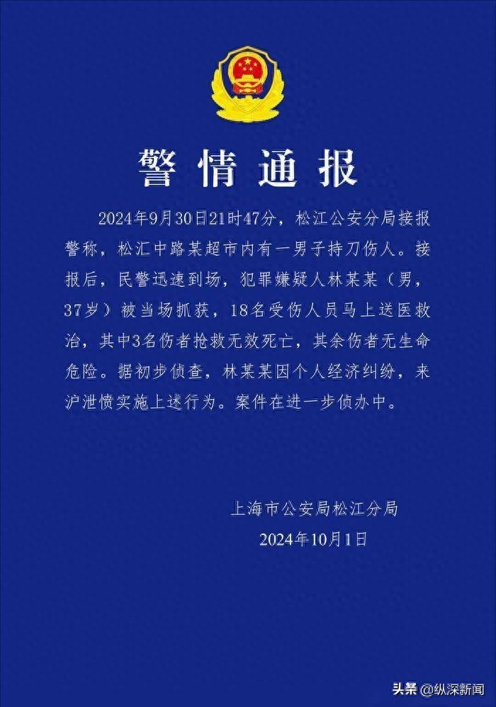上海松江警方通报:一男子超市内持刀伤人被当场抓获,3人抢救无效死亡