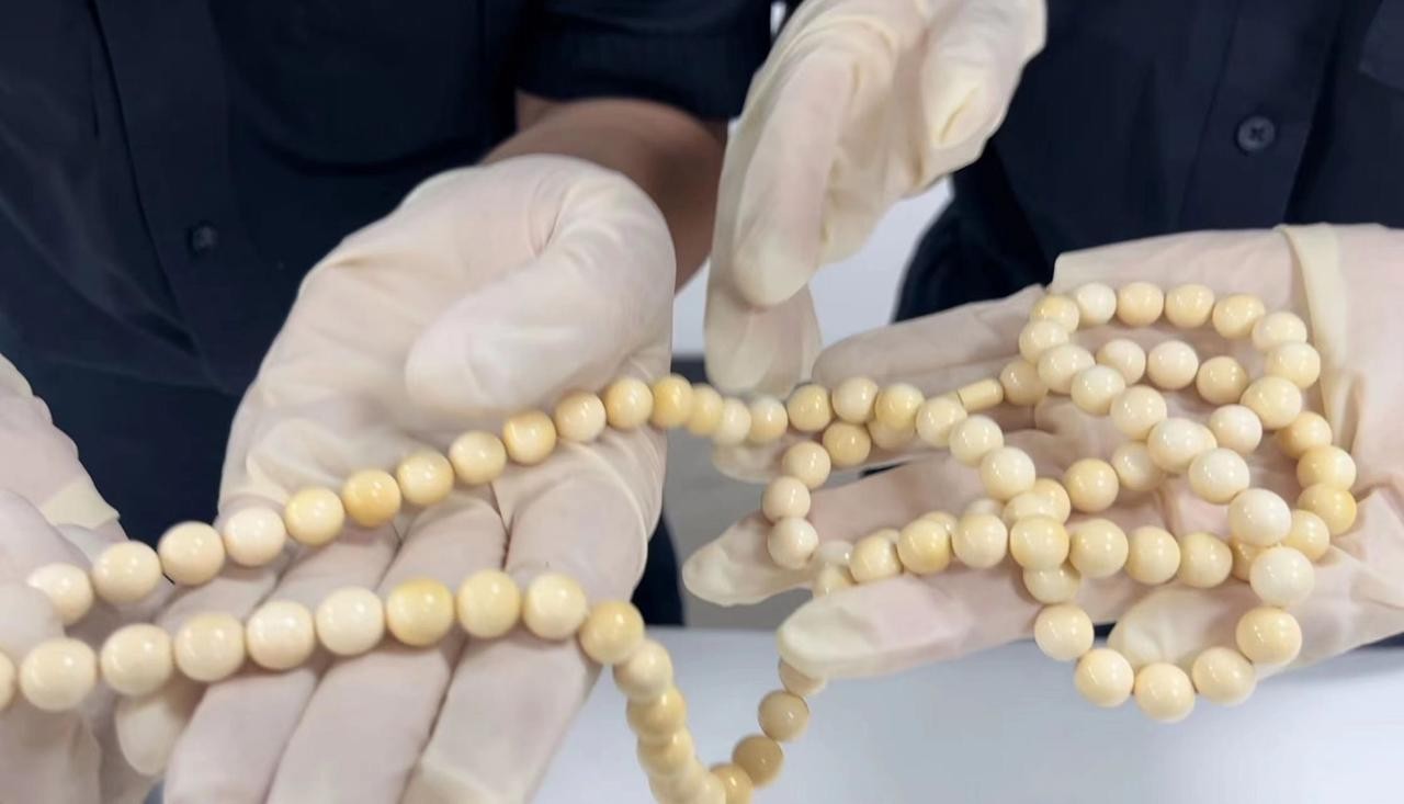 此前,关员在对一票申报为“食品”的进境邮件进行机检查验时,发现图像异常。经人工开拆查验,发现一串由100枚乳白色圆珠穿成的手串,圆珠均具有象牙特有纹路特征。经天津海关动植物与食品检测中心鉴定,上述物品为象牙制品,毛重88.7克。目前,该邮件已移交后续处置。