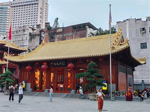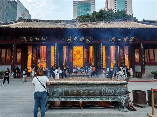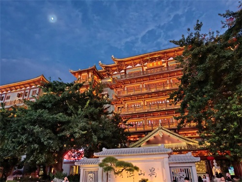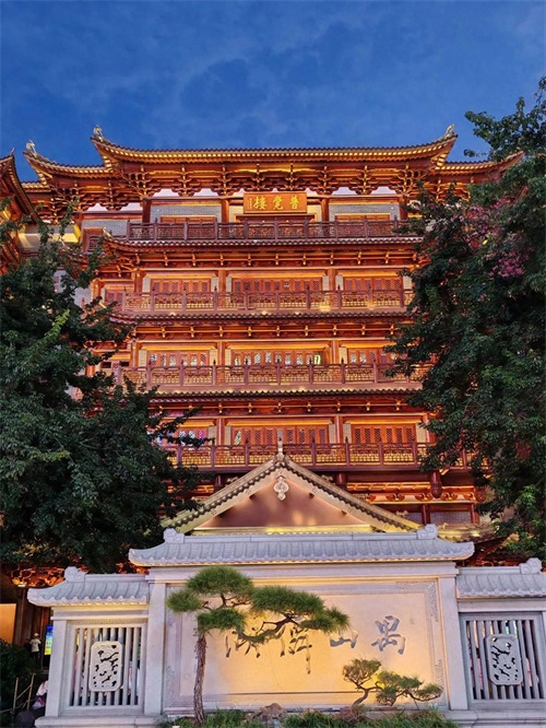 很难相信在繁华城市最热闹的市中心会有这么一座规模宏大的寺庙,这就是位于广州北京路步行街旁的大佛寺。大佛寺始建于1500年前的南汉时期,后几经战火洗礼,到解放时大部分被毁。后由政府规划重建,历经数次扩建,于去年底完工,才形成了现在的规模。大佛寺每天晚上六点开灯,夜幕下更显其宏伟壮观的身形,很有千与千寻中寺庙的感觉。