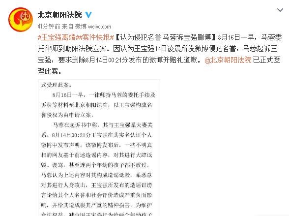 马蓉起诉王宝强侵犯她名誉权,要求王宝强删博道歉!