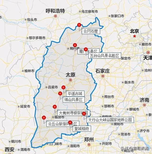 自驾游玩山西全部国家5A级旅游景区行程路线:太原-雁门关景区-云冈石窟-五台山风景名胜区-太行山大峡谷国家地质公园-皇城相府-云丘山旅游风景区-大槐树寻根祭祖园-绵山风景区-平遥古城-太原。