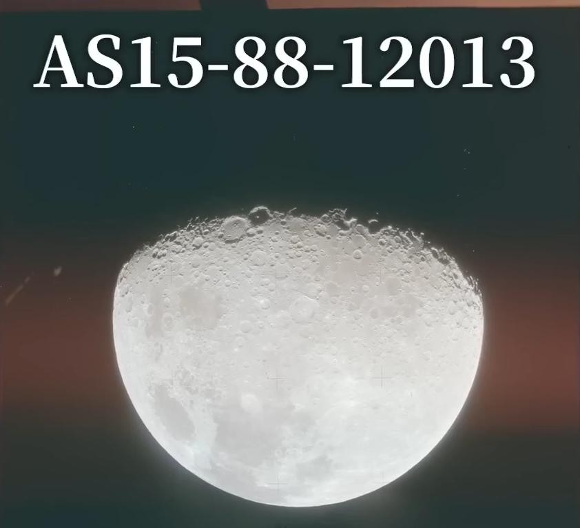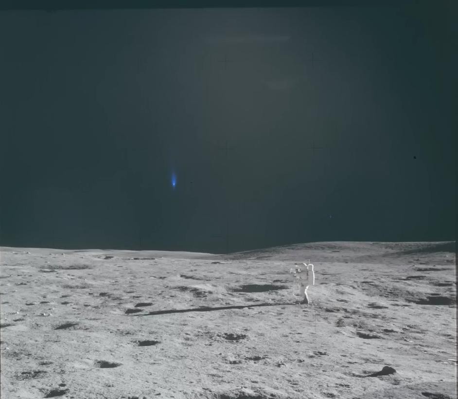 大家看就是这张照片,这是阿波罗12号拍下的,照片当中的艾伦宾,是站在一大块的玻璃面前,然后他们又发现了这张照片,编号是AS1588—2013,是阿波罗15号拍下来的,在这张照片当中,月球看起来就像是一圈辉光包围着,这圈辉光从月球表面,一直延伸到好几公里的空中,看起来就像是地球大气层,产生的散射效果,但是月球并没有大气层。为什么会造成这种辉光效果呢?