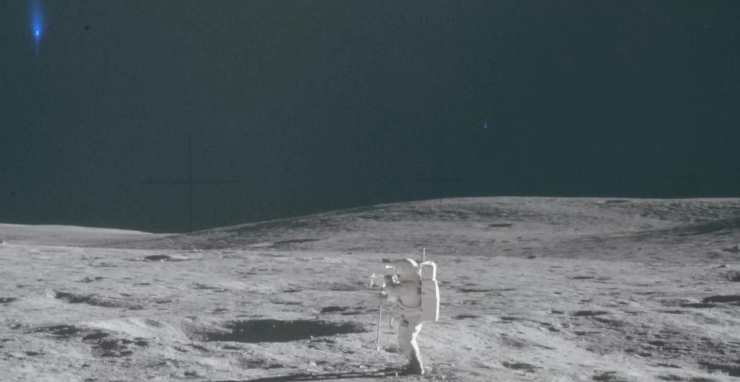 只见登月舱的飞行员米切尔正在前方进行科学实验,他的背后是大片月球的天空。肯惊奇的发现,天空中有些地方居然是蓝色的,但是在肯的认知里面,月球的天空肯定应该是漆黑一片,没有任何颜色的。地球上的天空之所以是蓝色的,那是因为地球大气的光线闪射的作用在月球拍照的时候,曝光的时间都很短,只有很亮的东西才会出现在照片中,而这张照片里的蓝色区域看起来像是蓝色的镜面反射。即使在NASA后来发布的正式照片里面,大部分蓝色区域也被处理掉了。