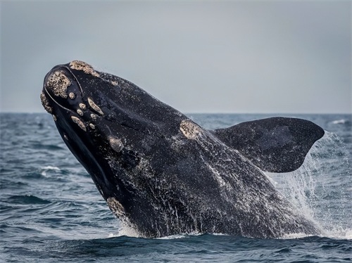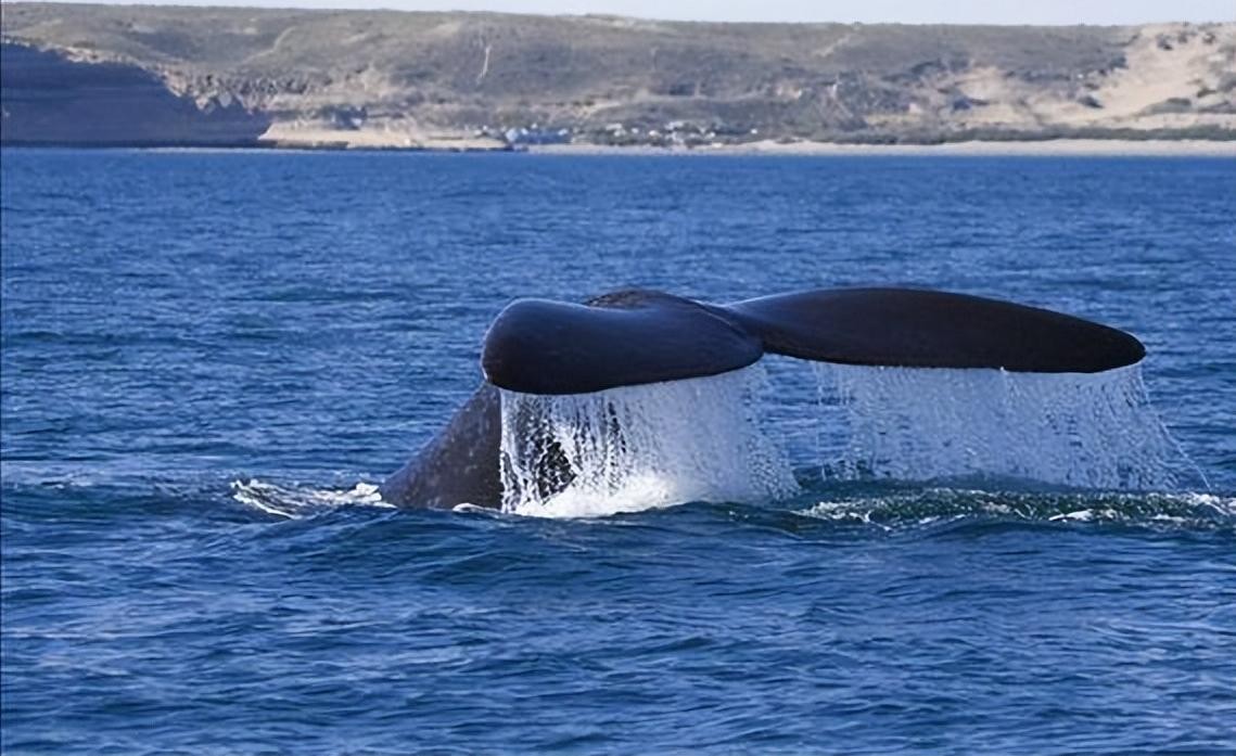 除了声音,北太平洋露脊鲸还通过尾部击打水面和喷水来进行视觉和声音的信号传递,这些行为可能用于群体协作、警告潜在威胁或者寻找伴侣。