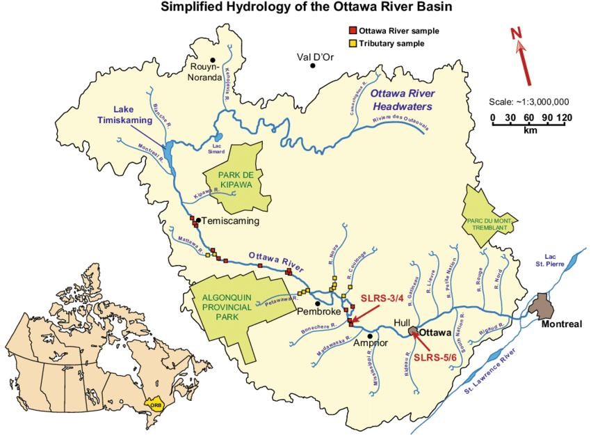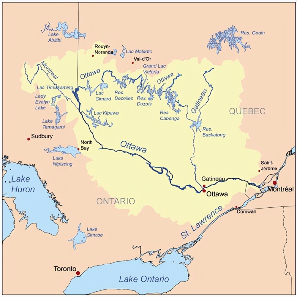 一、渥太华河:发源于魁北克省西南部劳伦琴高地,先向西流经过湖群,后转向东南,成为魁北克省和安大略省的界河,在蒙特利尔以西汇入圣劳伦斯河。渥太华河全长1271公里,流域面积146300平方公里,流量1950立方米/秒。其最大支流是加蒂诺河,河长386公里,流域面积23724平方公里,流量350立方米/秒,其他支流有列夫尔河(河长330公里,流域面积10400平方公里)、马达沃斯卡河(河长230公里,流域面积8470平方公里,流量85立方米/秒)、库隆日河(河长240公里,流域面积5060平方公里)等。