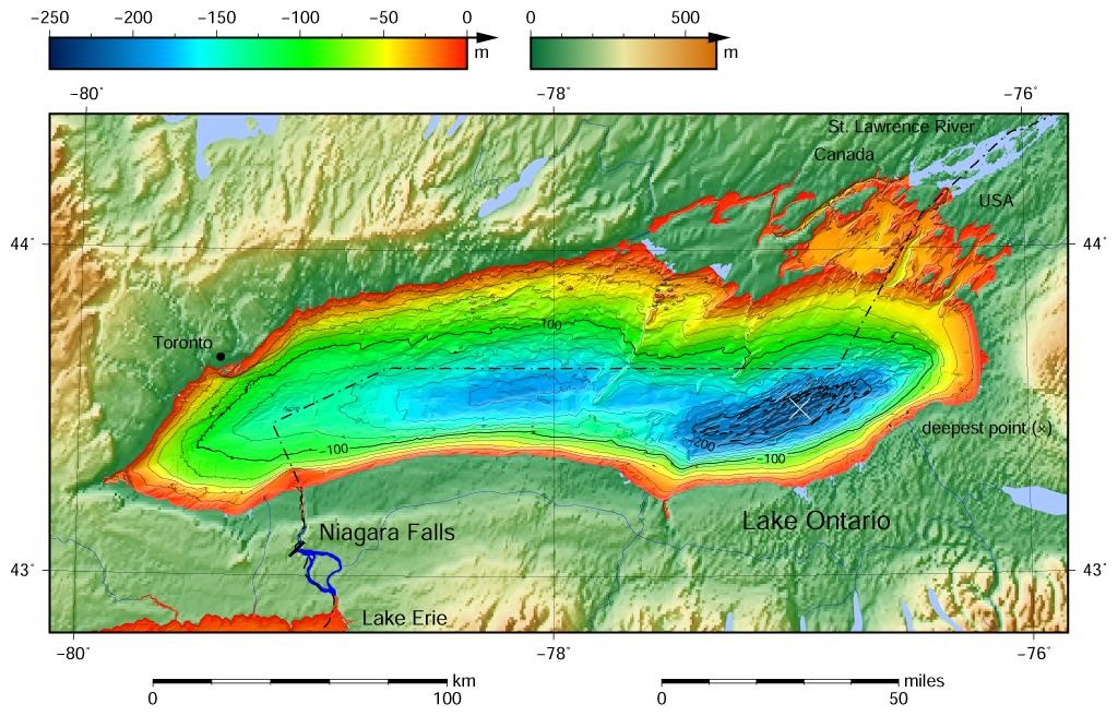 五、安大略湖:美、加界湖,面积1.96万平方公里,平均深度85米,最大深度244米,蓄水量1638立方公里,流域面积(不含湖面)约7万平方公里,经尼亚加拉河接纳上游四大湖的水量,河上有世界知名的尼亚加拉瀑布,湖水经圣劳伦斯河注入大西洋。入湖河流主要有奥斯威戈河(河长37公里,流域面积13270平方公里,流量195.7立方米/秒)、杰纳西河(河长253公里,流域面积6500平方公里)、布莱克河(河长201公里,流域面积5000平方公里,流量120立方米/秒)等。