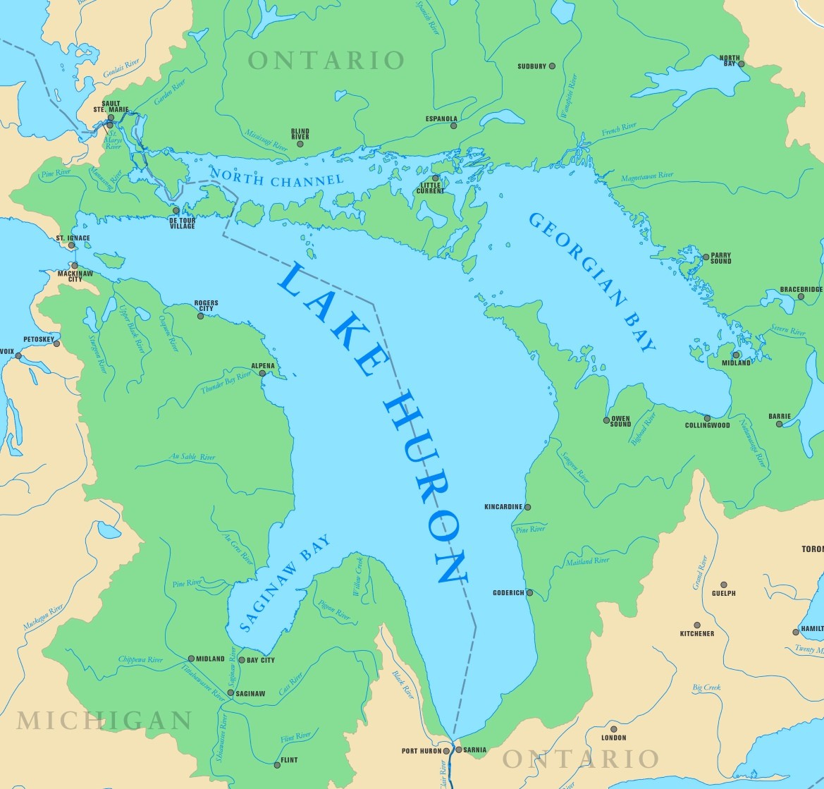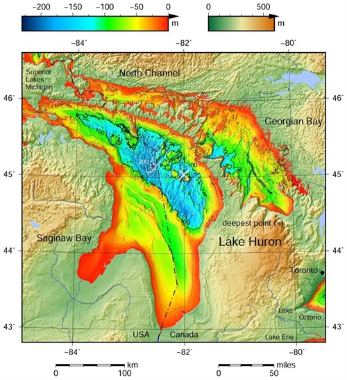 三、休伦湖:美、加界湖,面积5.96万平方公里,平均深度60米,最大深度229米,蓄水量3543立方公里,流域面积(不含湖面)13.39万平方公里,湖水经圣克莱尔河-圣克莱尔湖-底特律河注入伊利湖。入湖河流较大的有法国河(河长110公里,流域面积19100平方公里)、尼皮辛湖(流域面积12300平方公里)、西班牙河(河长338公里,流域面积14000平方公里)、密斯赛基河(河长266公里,流域面积9250平方公里)等。(下面示意图中均是较小的支流)