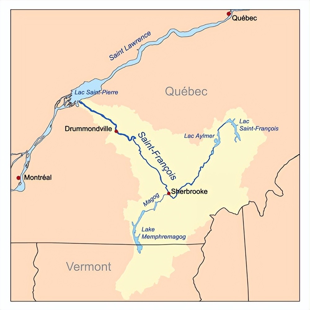 四、右岸(南岸)支流:圣劳伦斯河的右岸支流大多短小,最大支流为黎塞留河,源自尚普兰湖,河长124公里,流域面积23720平方公里,流量330立方米/秒,其中尚普兰湖集水面积21326平方公里,占其流域面积的近90%。其他较大支流有圣弗朗索河(河长218公里,流域面积10230平方公里,流量190立方米/秒)、邵迪耶尔河(河长185公里,流域面积6682平方公里,流量114立方米/秒)、亚马斯卡河(河长160公里,流域面积4784平方公里,流量83立方米/秒)等。