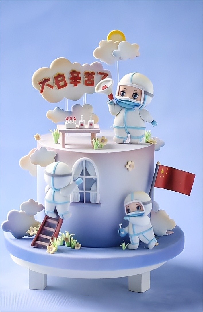 为了支持冬奥体育健儿,他把翻糖、面塑手艺与传统吹糖技术结合,做了一个最完美的冰墩墩出来;为了致敬抗疫的白衣天使,他做了一个“大白”翻糖蛋糕代百姓道出感谢。