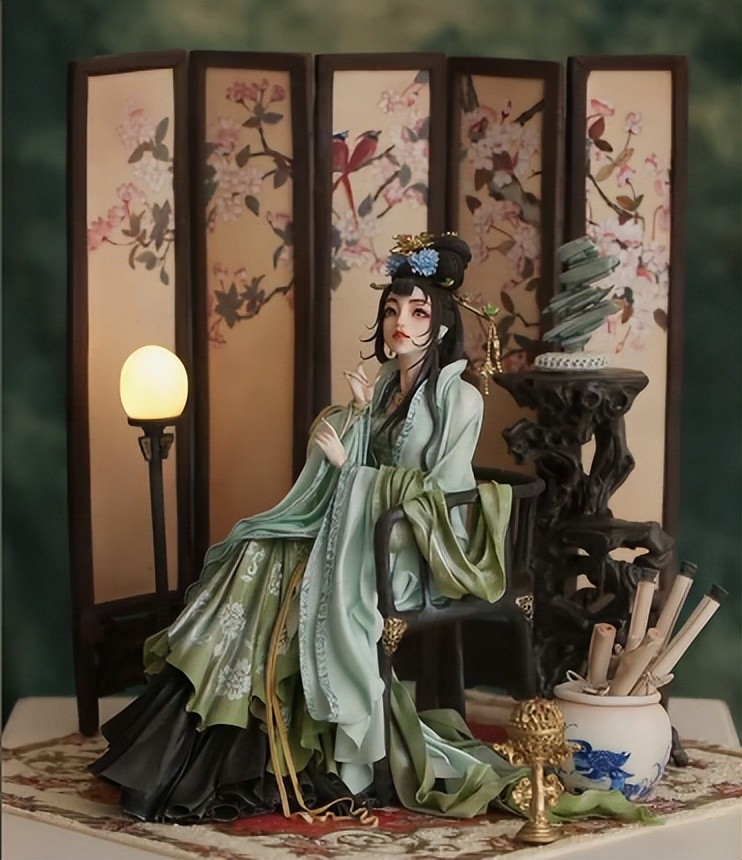 身边微亮的小宫灯,将她的美映照给大众,身后呼之欲出的花鸟屏风,仿佛在诉说她的心事,就连手边卷起来的文字画卷,都隐藏着她的满腹经纶。