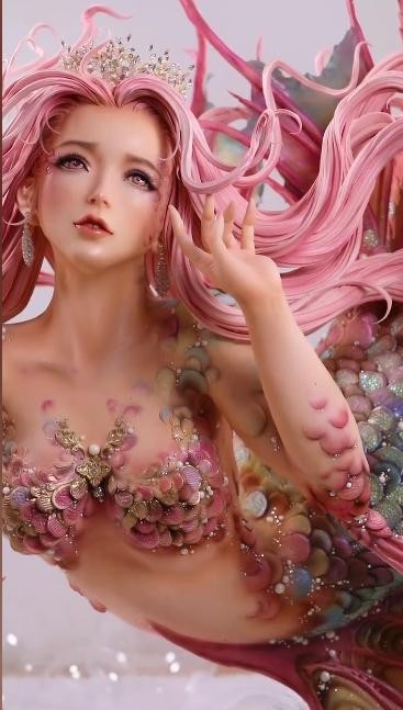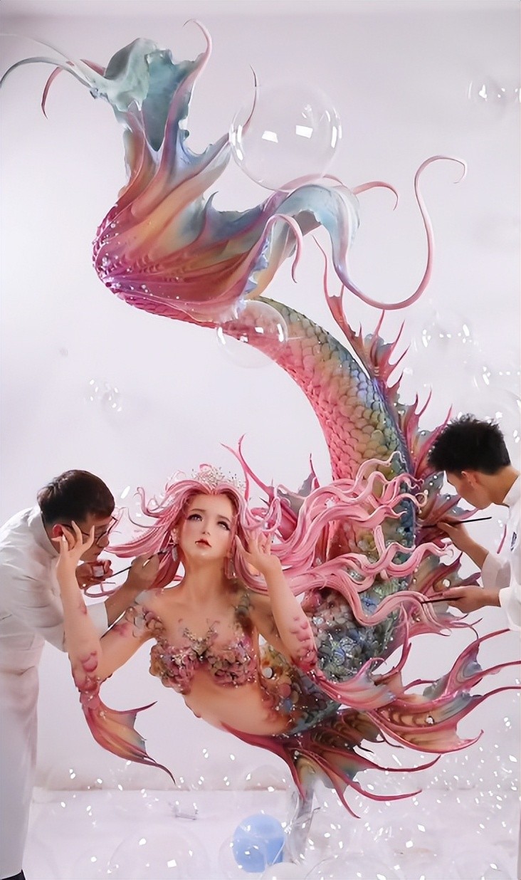 美人鱼身上的鳞片,都是他们一个个手工粘上去的,美人鱼脑袋上飘逸的头发,也都是他们一缕又一缕手工接上去的。