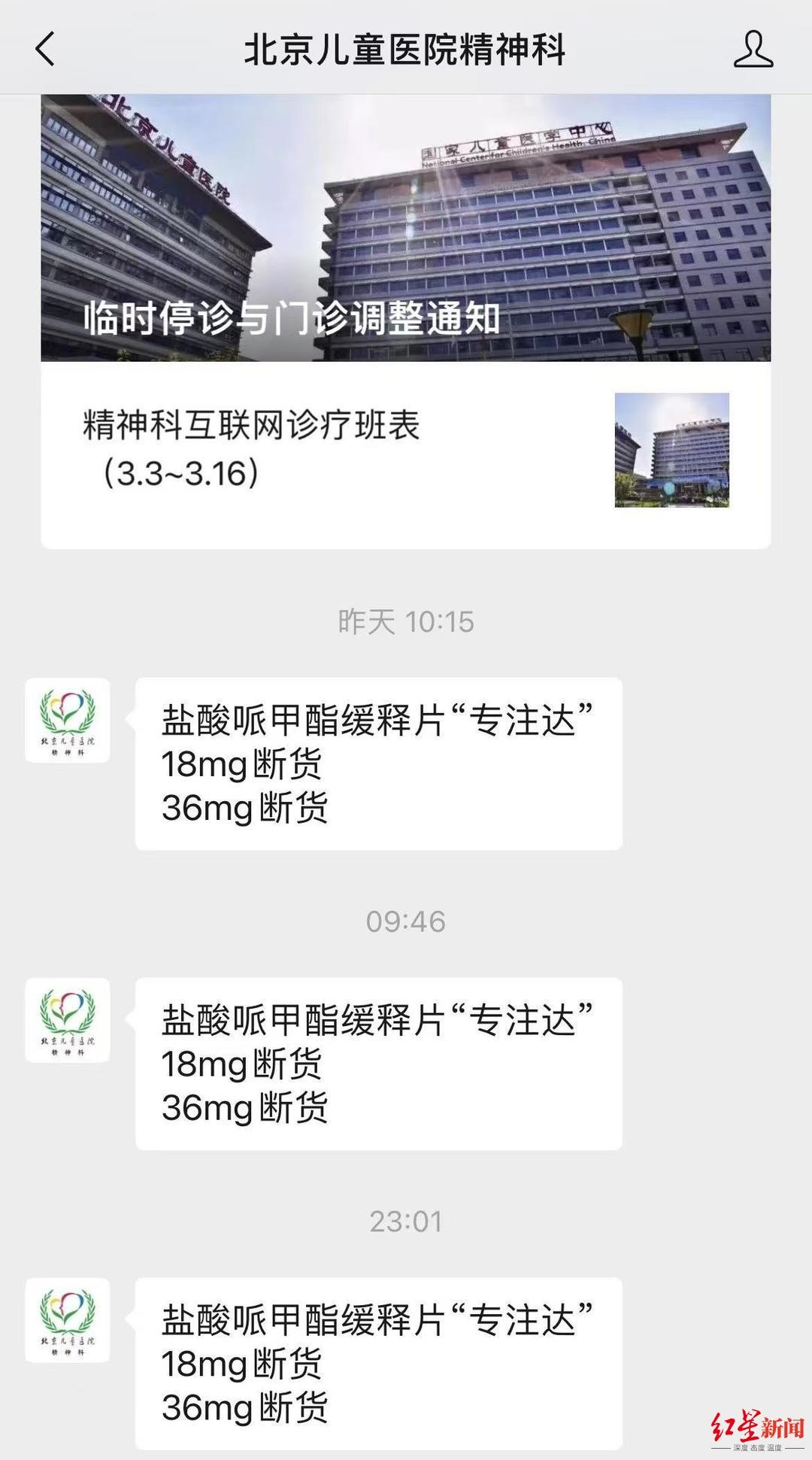 余女士告诉记者,专注达快见底前,她和家人就得每天不断给北京儿童医院的药房打电话询问。因询问者过多,医院公众号也专门开通了“专注达”查询通道,当日是否有药,患者点击公众号即可获悉。