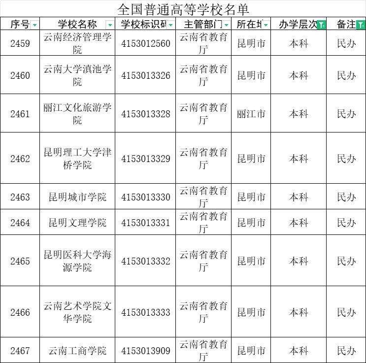2.专科学校(50所):云南省的专科(含高职)院校,一共有50所,这个数量在全国各省份里算中等偏下了。其中38所公办,剩余12所是民办高校。这38所公办高校都是云南省直接管辖,而剩余的12所民办专科学校中,均由云南省教育厅管辖。