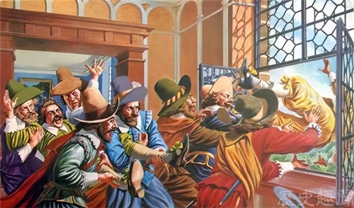 1618年,哈布斯堡王朝的神圣罗马帝国皇帝马蒂亚斯任命狂热的天主教徒斐迪南大公为波西米亚国王。波西米亚就是今天的捷克,首府在布拉格,民众普遍信仰新教。斐迪南不顾民意,下令强行禁止新教,拆毁新教教堂,将新教徒当做暴民镇压。布拉格人民忍无可忍,冲进王宫将斐迪南派来的三名钦差大臣扔出窗外。三人落到了干草堆上,侥幸未被摔死,狼狈逃回向斐迪南状告波西米亚民众造反。皇帝马蒂亚斯随即派兵镇压,三十年战争就此爆发。