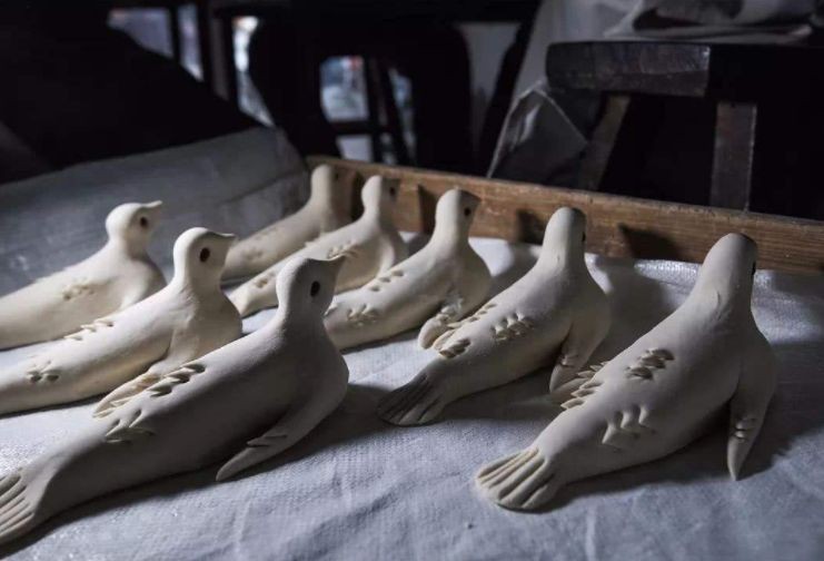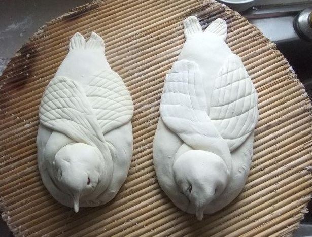 以赤豆装点2只眼睛,再为其增添丰满的羽翼,成就了栩栩如生的老雁形象。经过数十道的工序,一个个活灵活现的老雁馍脱颖而出,盖上大红寿字,寓意着父母平安。