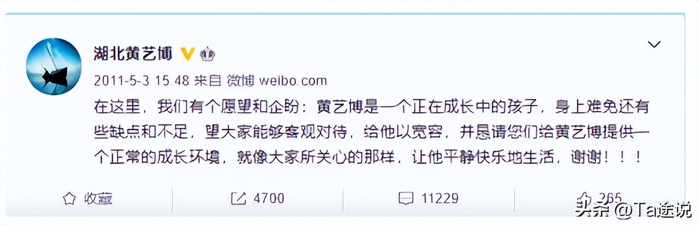 这也正是黄父黄母发布微博的原因,他们就是看到了媒体对儿子的过分追捧,担心哪天要是发现不足了,不会以一颗包容的心去看待黄艺博。