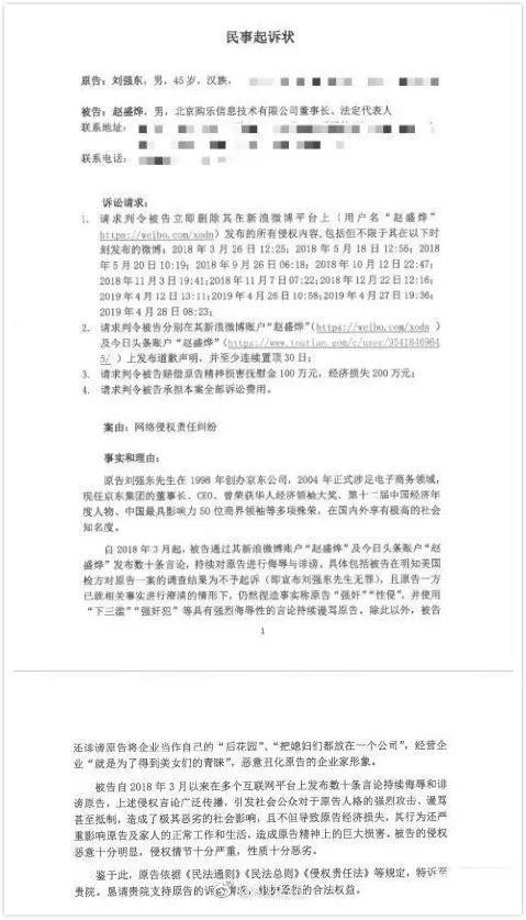 近日,赵盛烨在微博上公布了刘强东律师发给他的《民事起诉状》。