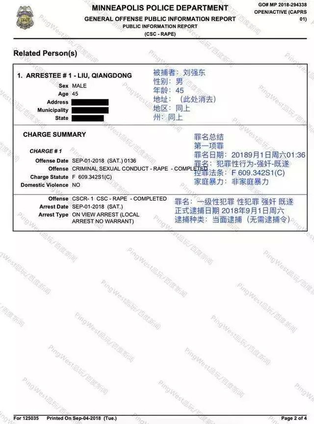 9月4日,明尼苏达警方公布了5页出警记录,称刘强东涉嫌的是一级强暴重罪。