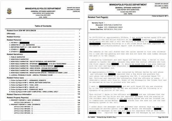 周二,明尼阿波利斯警察局公布了911报警记录、受害者在被控强奸后发送的短信、监控录像和两人在事发当晚在一起的照片,以及刘接受警方采访的音频。