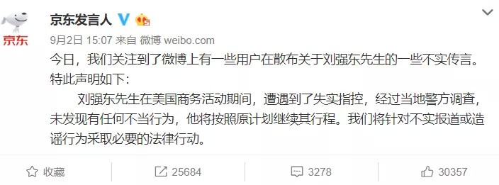 京东官方对此进行了回应,称刘强东在美国商务活动期间,遭遇到了失实指控,将针对不实报道或造谣行为釆取必要的法律行动,随后称刘强东已经回国。