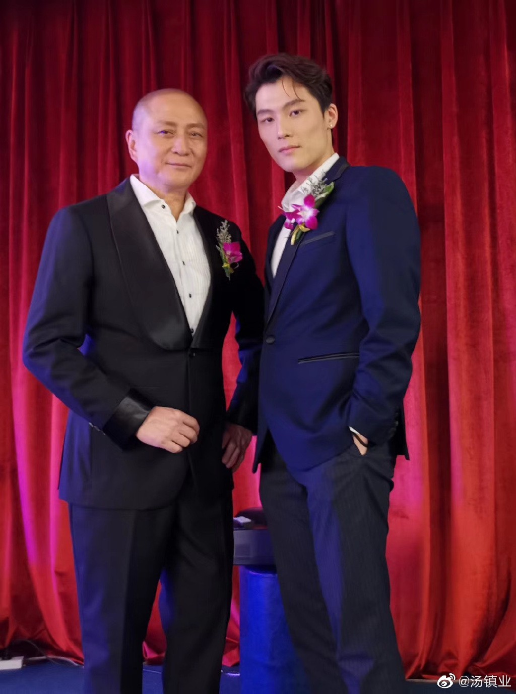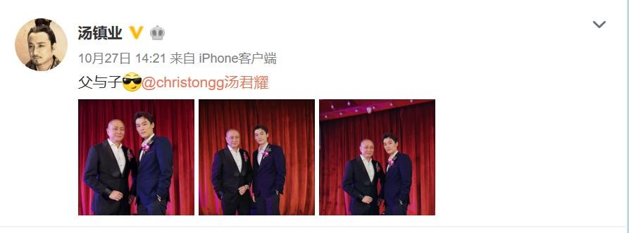 照片是汤镇业和儿子汤君耀的合照,父子两个都是西装笔挺,站在一起各领风骚。