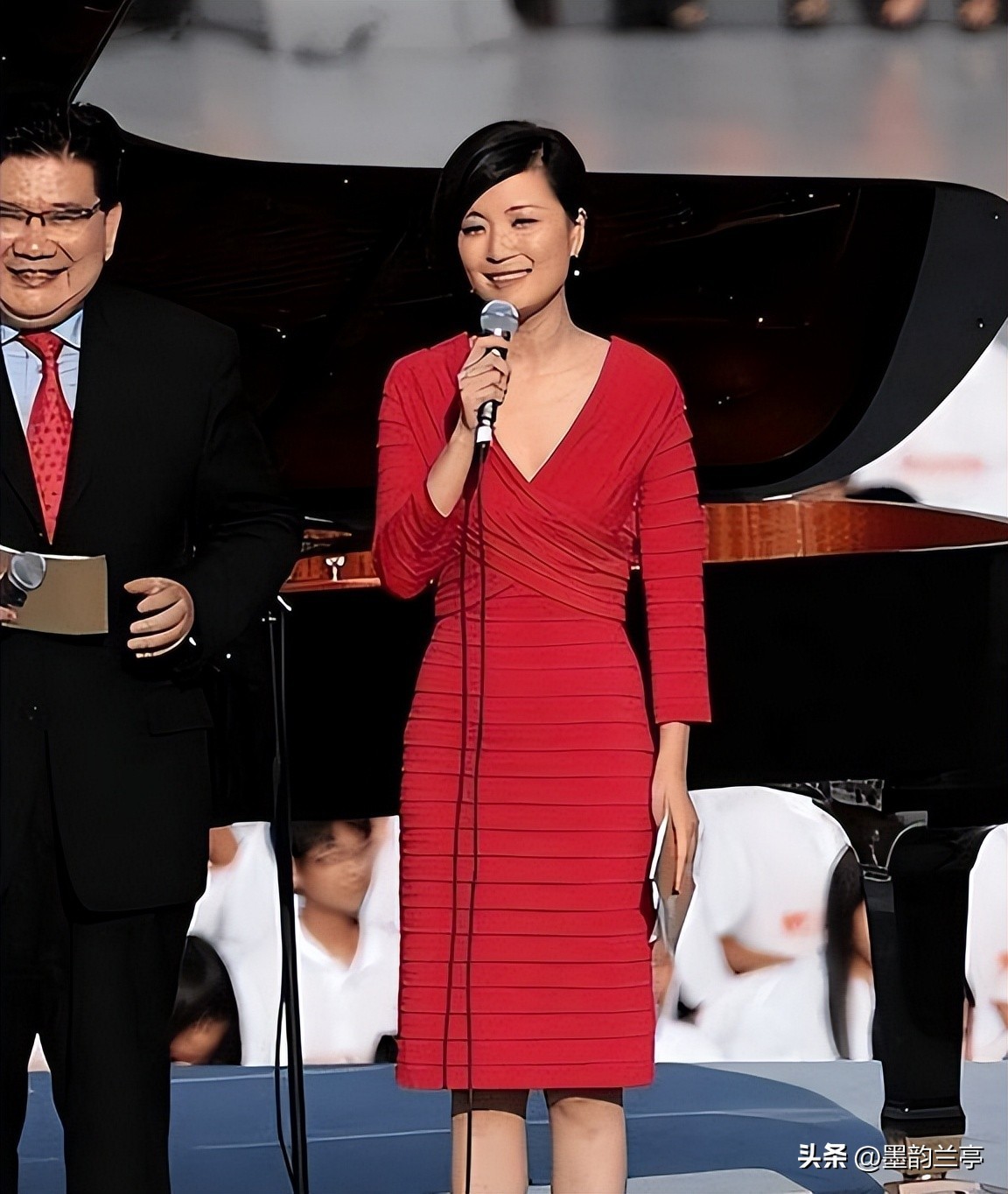 作为宴会的主持人之一,陈蓉身着一袭华丽的晚礼服,优雅地走上舞台。