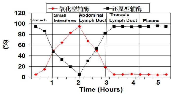 研究辅酶Q10的资深教授发表的研究结果显示,当受试者服用还原型辅酶Q10后,在消化道不同位置存在的还原型与氧化型辅酶Q10的比例,从胃部到小肠再到小肠后端,还原型辅酶比例先减少,后上升,最后到血浆中维持不变。