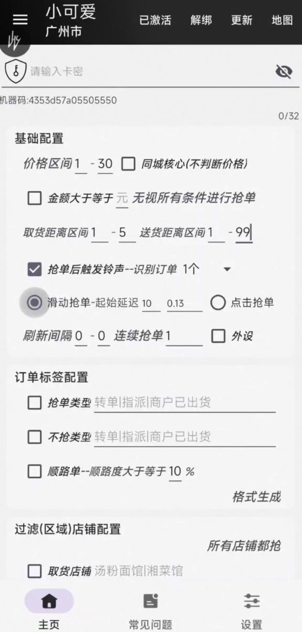 随后,记者打开这款“可爱捏”外挂软件,页面显示出强大的抢单功能,用户可以非常细致地设置参数,包括派单的价格区间、抢单类型、不抢类型等。通过地图设置抢单区域后,外挂就可以开始抢单。