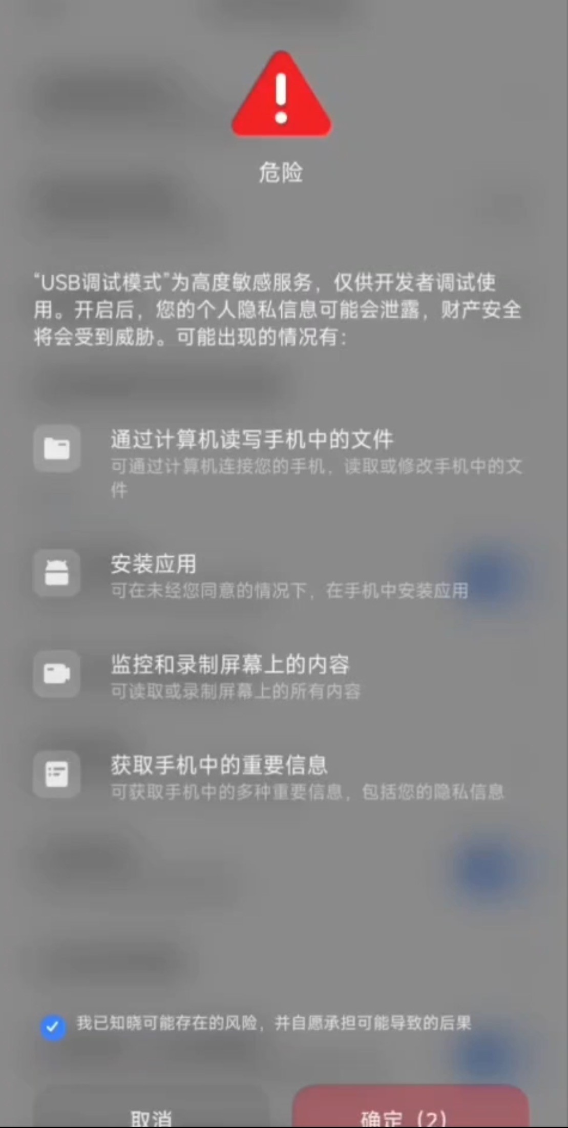 记者付款购买了软件外挂,随后徐彪发来激活码、软件安装包以及教学视频。按照步骤指引,首先需在手机设置中打开“开发者模式”,然后安装一款名为“可爱捏”的软件,并在开发者模式中开启“USB调试功能”。记者注意到,当这一选项被开启时,手机弹出“危险”提示,警告该模式为高度敏感服务,“开启后,您的隐私信息可能会泄露,财产安全将会受到威胁”。