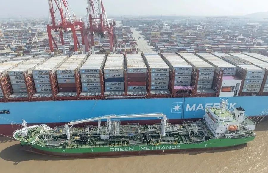 马士基大型甲醇动力集装箱船在上海港完成绿色甲醇船对船同步加注中国首单。