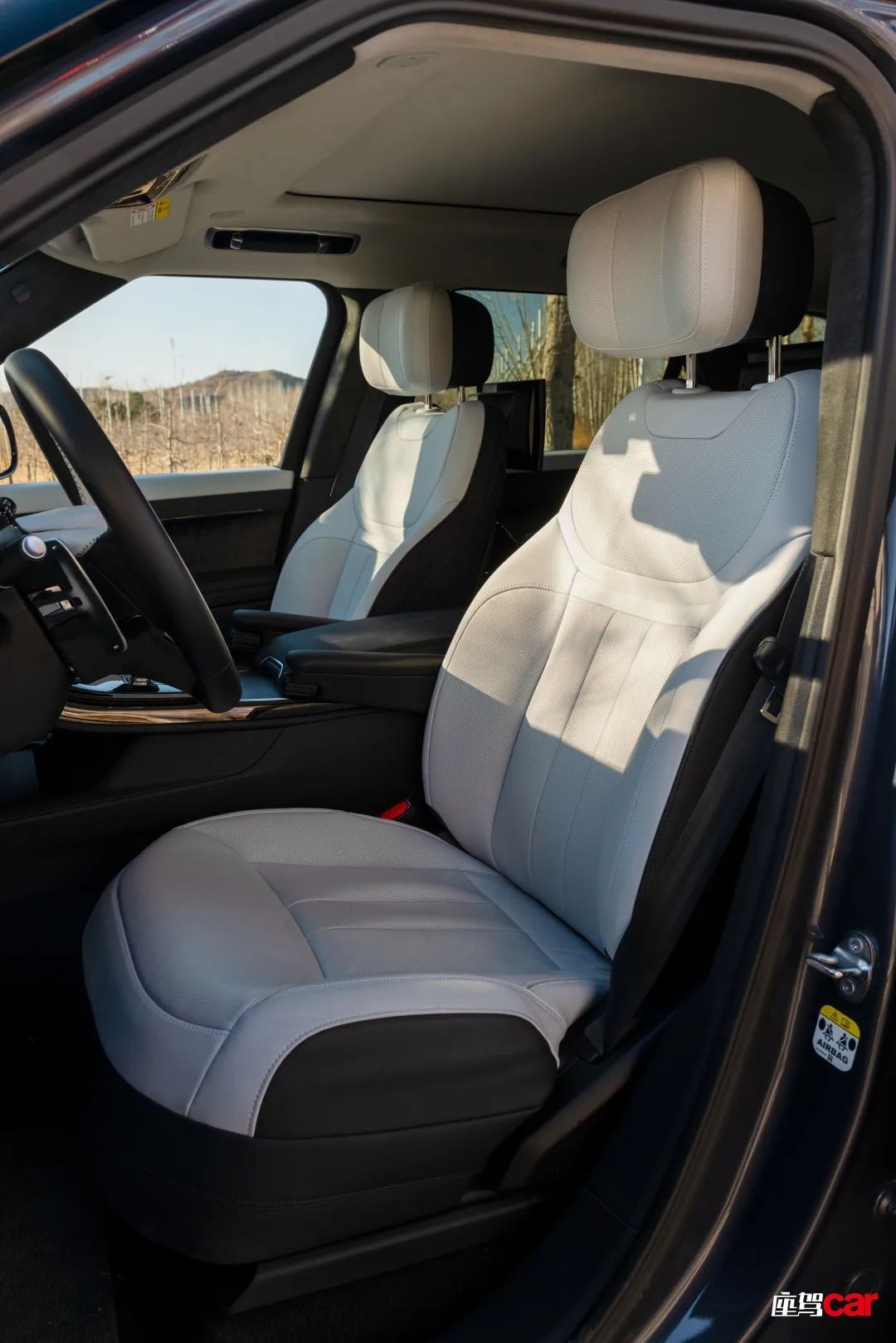 内饰部分,新车整体设计与路虎揽胜保持一致,最大区别在于用料,尤其是与上一代车型相比,有着显著的进步。曾经某些塑料饰板已经被皮革所代替,充分提升了豪华感。细节之处我们发现,在没有皮革包裹的位置新车采用了大量的碳纤维材质的饰板点缀,增添运动氛围。另外,四个门边位置有一处十分素雅的织物包裹装饰条,实际上MERIDIAN音响的扬声器被隐藏在其中,很好的将设计与功能巧妙地结合在了一起。至于科技部分,13.1英寸的悬浮曲面屏置于中央,采用全新的InControl OS2.0 信息娱乐系统,全面优化的高清触控屏菜单层级设计,至多两步即可实现 90% 的常用功能。仪表盘采用13.7英寸高清数字仪表盘,能够接收并显示关于驾驶方面的大量信息。另外,新车采用了与路虎揽胜同款的座椅,通风、加热、按摩功能一应俱全,同时内置扬声器的飞翼头枕也没有缺席,因此乘坐舒适性方面有了保障。然而,当我仔细打量一阵后发现两个人机工学的小问题,一是手机无线充电的位置被“藏”在中控屏与空调面板的夹缝中,拿取不便;二是路虎过往经典的可调节主副驾扶手在宽大的车载冰箱盖板面前稍显多余。除此之外,新款车型与之前相比,整体豪华感有了很大程度的提升,不负“揽胜”之名。